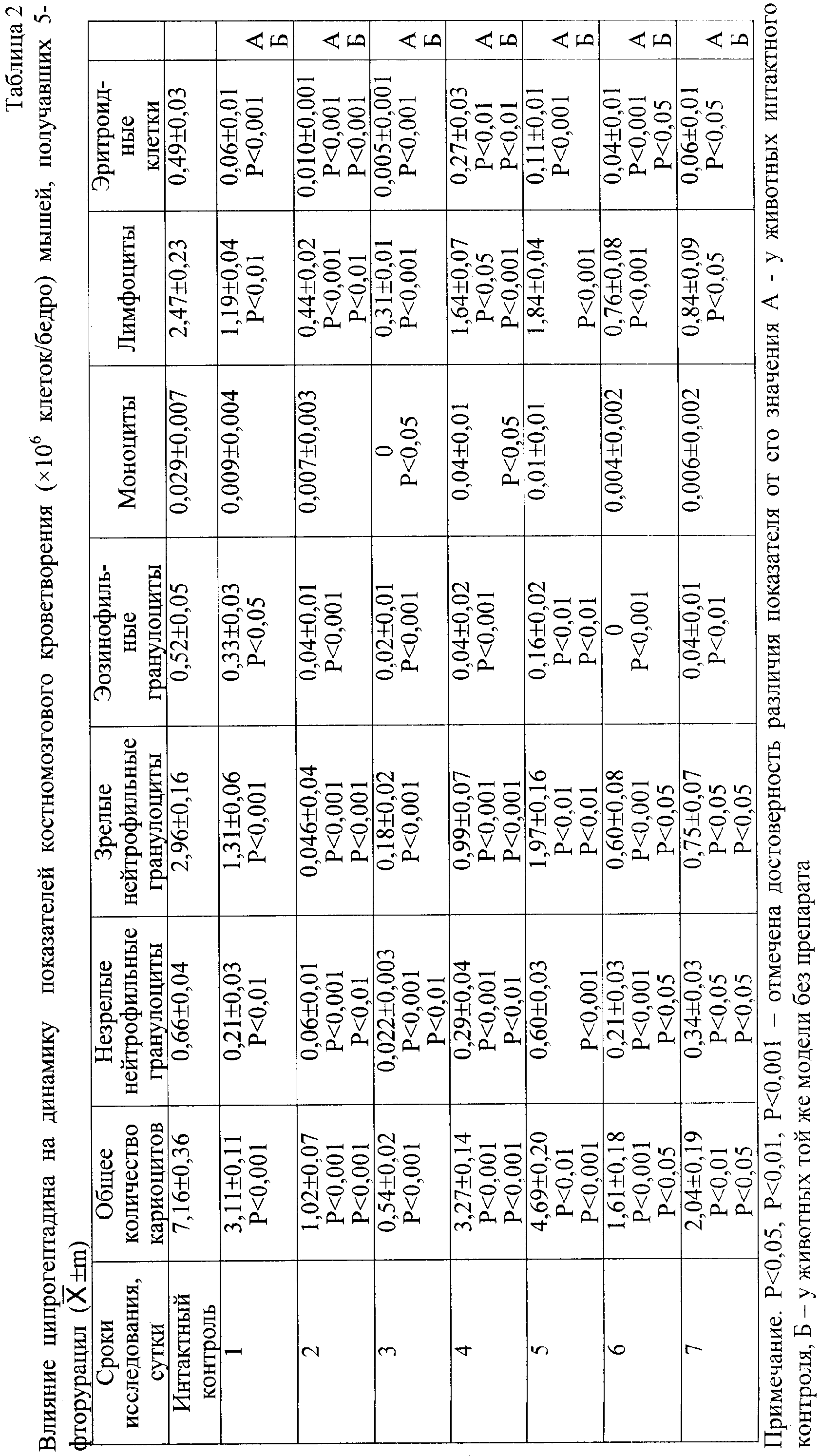 Изобретение относится к области медицины, конкретно к гематологии, и может быть использовано для фармакологической коррекции нарушений в системе крови, развивающихся при цитостатическом воздействии. Одним из основных патологических синдромов, вызванных полихимиотерапией, является депрессия эритроидного ростка кроветворения, которая ограничивает продолжительность применения цитостатиков при проведении химиотерапии. С целью коррекции нарушений эритропоэза, вызванных цитостатиками, применяют предшественники нуклеиновых кислот, витамины группы В, зимозан, рекомбинантный эритропоэтин, иммуномодуляторы и другие [1]. Однако указанные фармакопейные препараты не нашли широкого применения в клинической практике, так как они мало эффективны при глубокой депрессии эритрона и сами обладают побочным действием. Задачей, решаемой данным изобретением, является предотвращение депрессии эритроидного ростка кроветворения, развивающейся на фоне применения цитостатиков. Поставленная задача достигается применением антисеротонинового препарата ципрогептадина в качестве средства, способного предотвращать депрессию костномозгового эритропоэза, развивающуюся при цитостатических миелосупрессиях. Новым в предлагаемом изобретении является использование препарата ципрогептадина за 30 минут до введения цитостатического препарата. Нами впервые выявлена способность ципрогептадина предотвращать развитие депрессии эритроидного ростка кроветворения, развивающейся при цитостатических миелосупрессиях. Применение ципрогептадина по новому назначению стало возможным благодаря выявленному авторами новому свойству модулировать эритроидный росток при цитостатических миелосупрессиях. Ципрогептадин (перитол) относится к фармакологической группе блокаторов H1 гистаминовых рецепторов (регистрационный номер П Тяжелые анемические состояния, развивающиеся у онкологических больных в ходе проведения полихимиотерапии, по мнению большинства исследователей, связаны с высокой чувствительностью эритрона к токсическому действию цитостатических препаратов [4]. Ярким представителем группы цитостатиков является фторпиримидиновый антиметаболит 5-фторурацил, активно используемый в химиотерапии злокачественных образований. При этом на сегодняшний день не вызывает сомнений, что угнетение кроветворения при действии на организм различных цитостатических препаратов обусловлено не только непосредственным токсическим их влиянием на гемопоэтические клетки и стромальные элементы, но и нарушением функций системы локальной регуляции кроветворения [5]. Можно предположить, что коррекция антисеротониновым препаратом ципрогептадином нарушений эритропоэза при цитостатическом воздействии будет актуальной. Отличительные признаки проявили в заявляемой совокупности новые свойства, явным образом не вытекающие из уровня техники в данной области и неочевидные для специалиста. Идентичной совокупности признаков не обнаружено в проанализированной патентной и научно-медицинской литературе. Способ может быть использован для повышения эффективности лекарственной химиотерапии в эксперименте и клинике. Исходя из вышеизложенного, заявляемое изобретение соответствует критериям патентоспособности изобретения «Новизна», «Изобретательский у