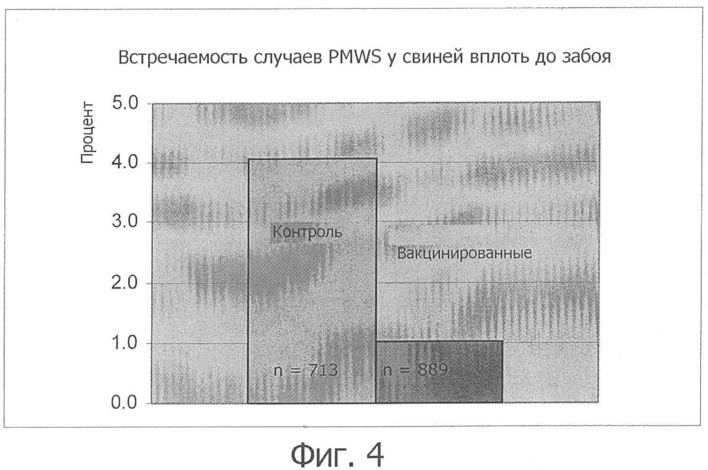 На фиг.4 представлены результаты полевого испытания эффективности, в котором поросята (n=889), рожденные от свиноматок, вакцинированных однократно до опороса вакцинной композицией, полученной в соответствии с настоящим изобретением, проявляли значительное снижение смертности (на 75%) от мультисистемного синдрома истощения после отлучения (PMWS, postweaning multisystem wasting syndrome) no сравнению с контрольными поросятами (n=713), рожденными от не вакцинированных свиноматок.