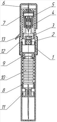 Импульсный автоинъектор работает следующим образом: отведя фиксатор 13 в сторону, нажимают кнопку пуска 7, при этом толкатель 6 воздействует на накольную иглу 5, которая прокалывает капсюль 3 и воспламеняет пороховую шашку 2. Газы, образующиеся при сгорании пороховой шашки, перемещают поршень 9, ампулу 10 и иглодержатель с иглой 11 внутри капсулы 8. В процессе движения нижний конец шприцевой иглы прокалывает дно капсулы, одновременно верхний конец иглы прокалывает ампулу 10, обеспечивая проход лекарственного препарата по каналу иглы. Выход иглы из капсулы 20-21 мм.