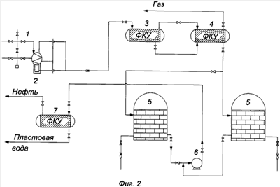 Установка работает следующим образом. От скважин (1) нагретая нефть, представляющая собой водонефтяную эмульсию, насыщенную углеводородными газами, через групповой замерный трап (2) поступает в трап-сепаратор первой ступени (3), представляющий собой емкость, оснащенную фильтрующе-коалесцирующим устройством (ФКУ). Размеры аппарата и ФКУ рассчитываются исходя из производительности газоводонефтяного потока. В трапе-сепараторе первой ступени при снижении исходного давления на рабочей высокоразвитой поверхности пористо-ячеистых фильтрующе-коалесцирующих материалов в ФКУ происходит частичная сепарация газа и частичное разрушение водонефтяной эмульсии. Выделившийся газ, который может содержать капельную нефть, поступает далее в верхнюю часть трапа-сепаратора второй ступени (4), а водонефтяной поток поступает в нижнюю часть трапа-сепаратора (4), где происходит сепарация остаточной части газа при понижении давления до технологических норм. Двигаясь через пористо-ячеистую структуру коалесцирующих материалов (ФКУ), газовый поток освобождается полностью от капельной нефти и поступает в газовую линию продукта, по показателям качества готового для переработки на заводах и для использования другими потребителями (в качестве энергоносителя, на газлифт и т.п.). Водонефтяной поток эмульсии, проходя через слои пористо-ячеистых материалов ФКУ (4), подвергается более глубокому разрушению и выводится в сборную емкость нефти с понтонами (5). В сборной емкости (5) более крупные глобулы и линзы пластовой воды оседают на дно и при накоплении в нижней части емкости (5) выводятся в автоматическом режиме, а водонефтяная эмульсия дожимным насосом (6) подается в трап-сепаратор третьей ступени (7). Пройдя пористо-ячеистый слой ФКУ трапа-сепаратора (7), водонефтяная эмульсия подвергается глубокому разрушению и полному расслоению нефтяной и водной фаз.