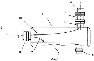 На фиг.1 изображено: 1 – сепаратор; 2 – выходной газовый штуцер; 3 – выходной газовый патрубок; 4 – технологическая линия газопровода; 5 – выходной штуцер нефтеводяной смеси; 6 – нефтеводяная смесь в сепараторе; 7 – поток нефтеводяной смеси из входного штуцера нефтеводогазовой смеси в сепаратор; 8 – входной штуцер нефтеводогазовой смеси; 9 – входной поток нефтеводогазовой смеси во входной штуцер; 10 – газ с капельной жидкостью, поступающий в выходной газовый патрубок.
