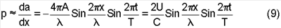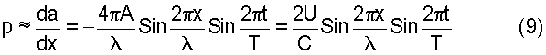 Обратимся теперь к вопросу о распределении давления в стоячей волне. В волне, распространяющейся в направлении сил оси x, давление р пропорционально изменению смещения вдоль x, т.е. величине d a/dx. Дифференцируя выражение (7) по x, получим