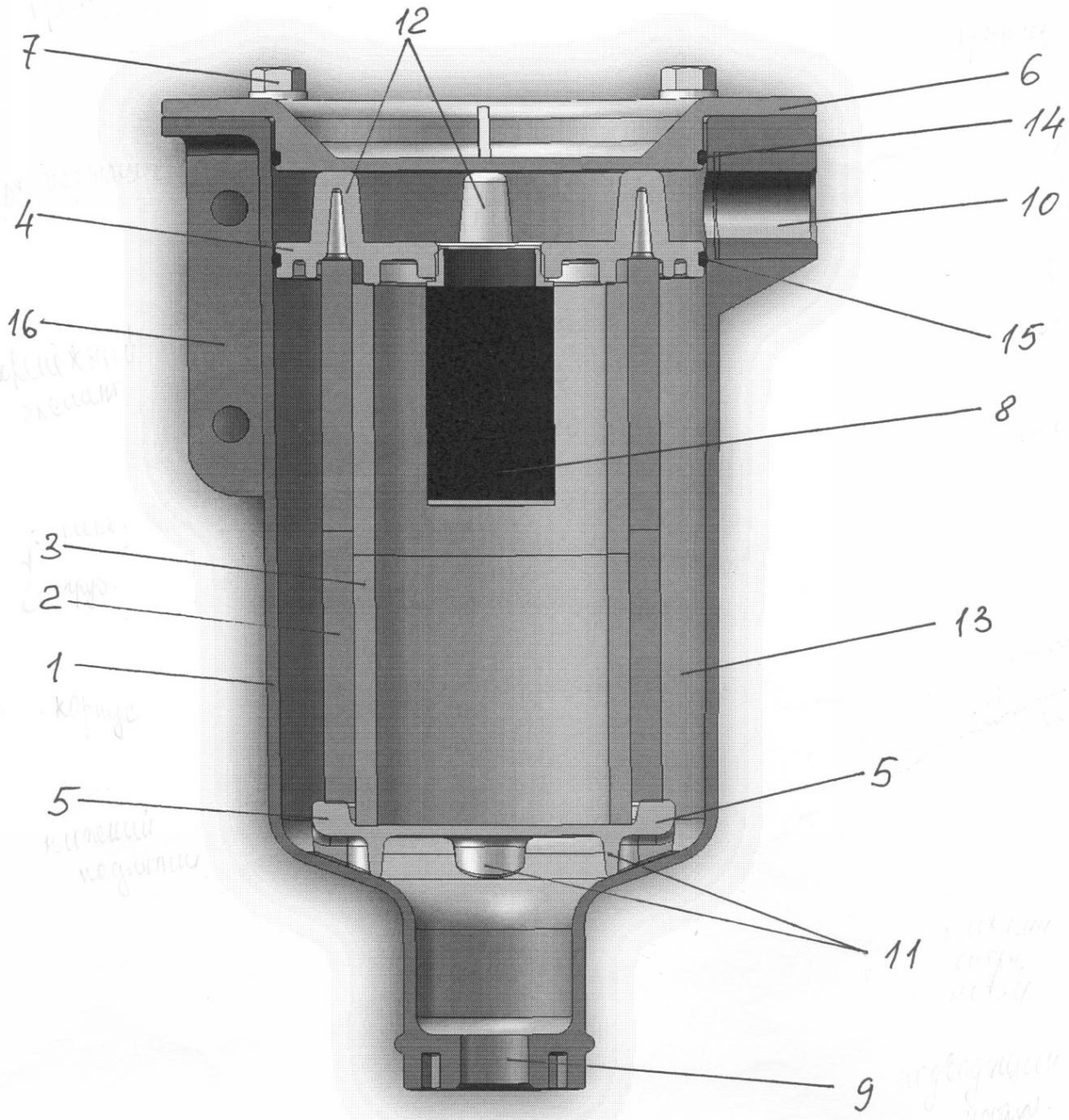 Циркуляция воздуха осуществляется следующим образом. Очищаемый воздух подается через подводящий патрубок 9 в полость, образованную нижними опорными ножками 11 нижнего подпятника 5, и проходит в пространство между внутренней стенкой корпуса 1 и внешней стенкой фильтрующего элемента 2 грубой очистки. Далее очищенный воздух проходит через фильтрующие элементы 2 и 3 во внутреннюю их полость и далее через дополнительный фильтр-влагоотделитель 8 поступает в верхнюю полость между верхним подпятником 4 и крышкой 6, образованную верхними опорными ножками 12 верхнего подпятника 4, и выходит через отводящий патрубок 10 очищенный от влаги. Отфильтрованные механические примеси и вода стекают через внешнюю кольцевую полость 13 и подводящий патрубк 9. Герметичность в отводящем патрубке и в полости под крышкой 6 обеспечивается кольцевыми прокладками 14 и 15, установленными в кольцевых пазах на внешней боковой поверхности верхнего подпятника 4 и крышки 6 сопрягаемых в верхней части с корпусом 1.