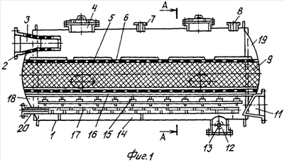 Горизонтальный адсорбер содержит цилиндрический корпус 1 со сферическими левой и правой крышками 18 и 19. В верхней части корпуса 1 смонтированы загрузочные люки 4 с предохранительными мембранами, штуцер 8 для отвода паров при десорбции и штуцер 7 для предохранительного клапана. В левой крышке 18 расположен штуцер 2 с распределительной сеткой 3 для подачи паровоздушной смеси при адсорбции и воздуха при сушке и охлаждении. В средней части корпуса 1 на балках 15 с опорами 14, поддерживающими колосниковую разборную решетку 16, на которой уложен слой сетки 6, размещен слой адсорбента 9. На верхнюю сетку 6, прикрывающую слой адсорбента 9, положены грузы 5 для предотвращения уноса адсорбента при десорбции. Выгрузка отработанного адсорбента 9 осуществляется через, по меньшей мере, два разгрузочных люка 10, расположенных симметрично относительно вертикальной оси корпуса (фиг.2). В днище корпуса смонтирован смотровой люк 12 со штуцером 13 для отвода конденсата и подачи воды, а также барботер 17 со штуцером для подачи водяного пара. Барботер 17 выполнен по всей длине корпуса в виде, по меньшей мере, одной перфорированной цилиндрической трубы и закреплен на поверхности днища посредством распорок. Коэффициент перфорации цилиндрической поверхности барботера лежит в оптимальном интервале величин: К=0,5 0,9. Штуцер 11 для отвода очищенного газа расположен на правой сферической крышке 19.
