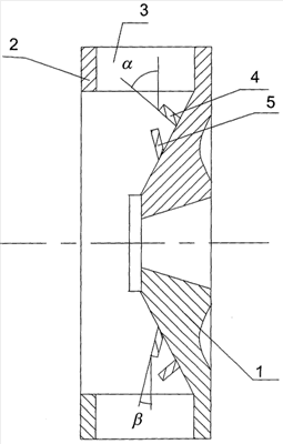 Размалываемый материал, поступающий через подающий патрубок (не показан) в область центральной части основного диска 1, попадает на мелющие лопатки 3 и ими размалывается. При своем движении в сторону размольных лопаток 3 материал перемещается вблизи внутренней стенки основного диска 1. На пути следования материал встречает отбойные диски 5 и 4. Ударяясь о диски 4 и 5, частицы материала дополнительно размалываются и, изменяя свое направление, перемещаются по длине мелющей лопатки 3 равномерно. Благодаря тому, что отбойных дисков по меньшей мере два и угол наклона образующей диска 4 к вертикали не равен углу наклона образующей диска 5 к вертикали, распределение материала по длине мелющей лопатки 3 происходит более эффективно, что особенно важно для мельниц крупных размеров. Кроме этого, достигается дополнительный сепарационный эффект, т.к. материал, проходя с одного отбойного диска к другому, провеивается вентилируемым компонентом, который увлекает мелкие частицы размолотого материала в сторону потока готовой пыли. При этом при установке дисков 4 и 5 с углами образующих к вертикали и , увеличивающимися от центра к лопаткам, сходящие по инерции с отбойных дисков достаточно крупные частицы вследствие пересечения траекторий их движения дополнительно размалываются. Ротор износостоек, компактен, не мешает вентиляции и увеличивает эффективность работы мельницы.
