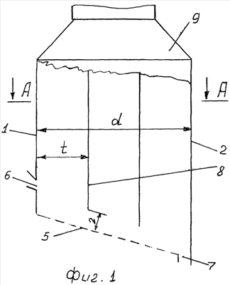 Расстояние t от передней стенки 1 до первой перегородки 8 и между соседними перегородками удовлетворяет соотношению q