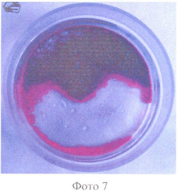 Для сравнительной оценки эффективности демеркуризации растворами перхлоратов и другими растворами демеркуризаторов была разработана методика равномерного нанесения ртути на поверхность (Методика 1). Методика заключалась в заливке капли ртути массой 5 г 100 мл хлористого метилена, взбалтывании хлористого метилена с ртутью в течение 2-3 минут, отстаивании капель ртути (Фото 4), отборе 1 мл хлористого метилена в мерную пипетку (Фото 5) и равномерном нанесении на ограниченную поверхность чашки Петри площадью 64 см2 (Фото 6). Хлористый метилен испаряется в течение 2-3 минут, обеспечивая равномерную и воспроизводимую загрязненность поверхности ртутью.