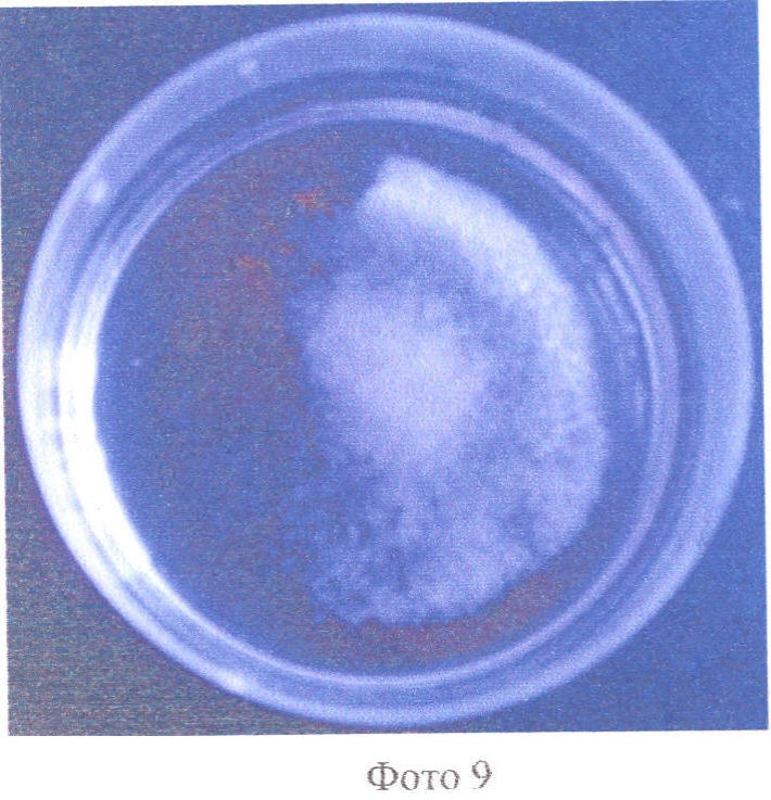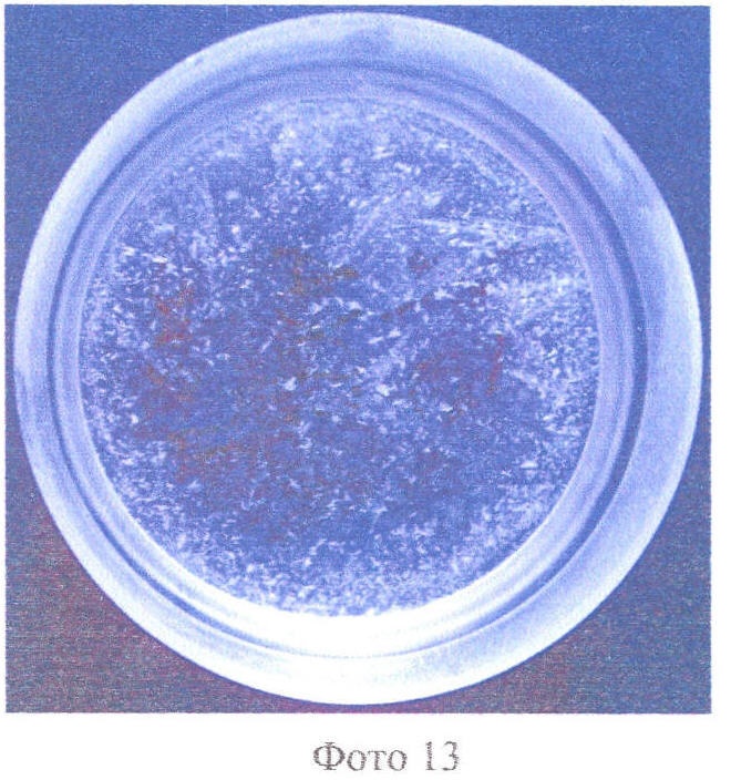 Демеркуризатор бесцветный, покрылся коркой замершего раствора, на дне чашки Петри видны кристаллы ПХА, выпавшие в осадок |