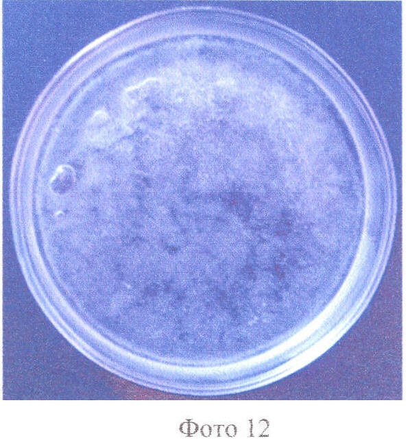 На поверхности чашек Петри, искусственно загрязненных ртутью, содержащейся в объеме 1 мл хлористого метилена, были нанесены водные растворы демеркуризаторов: 20% водный раствор хлорного железа, 0,2% водный раствор марганцовокислого калия KMnO4, подкисленный соляной кислотой (из расчета 5 мл соляной кислоты плотностью 1,19 г/см3 на 1 л 0,2% раствора), 5%, 10% и 15% водные растворы перхлората аммония NH4ClO4 с 10%-ным содержанием хлорида аммония в растворе.