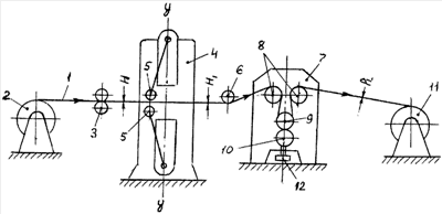 Прокатываемая полосовая заготовка 1 с исходной толщиной Н из разматывателя 2 с помощью задающих валков 3 поступает в маятниковую клеть 4 стана, где металл обжимается на величину (0,75 0,85)Н рабочими холостыми валками 5, совершающими возвратно-поступательное движение в вертикальной плоскости относительно оси y-y. Затем полоса толщиной Н огибает промежуточный ролик 6 и поступает в четырехвалковую клеть 7, где огибает три валка 8 и 9. Обжатие полосы осуществляется при прохождении ее между приводными валками 9 и 10, лежащими в общей осевой (вертикальной) плоскости, а величина этого обжатия регулируется с помощью нажимного устройства 12, изменяющего межвалковый зазор. Суммарный угол огибания полосой валков 8, 9 – 500° 560°.