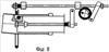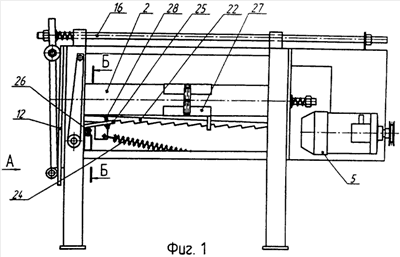 Механизм смыкания разъемных матриц 11, 12 представляет собой кулачковый вал 17, установленный на станине 1 в опорах 18. На валу 17 имеются два запорных кулачка 19, взаимодействующих с боковыми наружными поверхностями упоров 14 матрицы 12, и два удерживающих кулачка 20 с рабочей поверхностью не менее 1/4 площади круга, взаимодействующих с внутренними нижними поверхностями упоров 14. Кроме того, на валу 17 имеется подающий кулачок 21, который взаимодействует с зубчатой рейкой 22 с пилообразным зубом, входя в контакт с ее выступом 23. Передний конец рейки 22 подпружинен в направлении вниз назад пружиной 24 и входит в паз пластины 25, установленной с возможностью качания на оси 26, параллельной валу 17. Задний конец рейки 22 входит в паз толкателя 27, установленного с возможностью продольного перемещения по наружной поверхности эталона 2.
