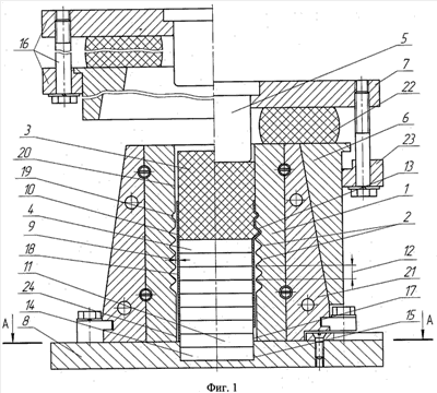 На фиг.1 изображен штамп для формообразования сильфонов, продольный разрез (вид слева от оси симметрии – в исходном положении, вид справа – в конце формообразования детали).