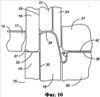 фиг.10 – вид спереди в вертикальном поперечном разрезе одного из вариантов осуществления настоящего изобретения, показанного в процессе формирования торцевой крышки, где внутренняя нажимная втулка обеспечивает опору для части зажимной стенки и среднего участка закатываемой панели;