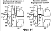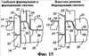 фиг.14 – сравнительный вид спереди в вертикальном поперечном разрезе известного формовочного устройства (на чертеже справа) и одного из новых вариантов осуществления настоящего изобретения (на чертеже слева) в процессе формирования;
