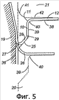 На фиг.4 и 5 показан вид спереди в вертикальном поперечном разрезе для одного из известных вариантов исполнения однооперационного формовочного пресса, предназначенного для изготовления торцевых крышек тары. Более конкретно, на фиг.5 представлен более подробно вид спереди в вертикальном поперечном разрезе, показывающий геометрическую форму поднутрения торцевой крышки относительно формирующего инструмента, представленного на фиг.4. Как показано на фиг.4 и 5, закатываемая панель незакатанной оболочки 1 для напитков удерживается в положении между верхней поверхностью 34 кольцевого сердечника штампа и поверхностью (43) выталкивателя или нажимной втулки, в то время как зажимная стенка торцевой крышки расположена напротив внутренних стенок 36 кольцевого сердечника штампа. Центральная панель 12 торцевой крышки зажата между пуансоном 21 поднутрения и пуансоном 20 панели. На фиг.5 геометрическая форма торцевой крышки 1 представлена более подробно с изображением положений кольцевого сердечника 19 штампа, пуансона 20 панели и пуансона 21 поднутрения.