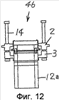 Вблизи правой стороны поворотного несущего приспособления 13, вместо приспособления 12 для извлечения, применяемого в предыдущих вариантах осуществления, расположено альтернативное приспособление, то есть передаточный механизм 12а для переноса блоков 46 верхней и нижней опок. Основные агрегаты поворотного несущего приспособления 13, по существу, идентичны таковым в других вариантах осуществления. Однако поворотное несущее приспособление 13 обладает диапазоном поворота между прессовой машиной 9, в которой спаренные верхняя и нижняя опоки расположены в их горизонтальных положениях, и передаточным механизмом 12а.