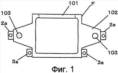 Фланцы (установочные элементы) 102 соединены с наружными поверхностями пары противоположных стенок из внешних стенок опоки F. Одно сквозное отверстие выполнено сквозь каждый фланец 102 так, что два отверстия находятся напротив одно другому через проем опоки.