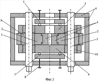Перед началом работы на рабочую поверхность верхней 5 и нижней 6 плит наносится противопригарное покрытие. При нанесении противопригарного покрытия оно проникает в углубления 11, выполненные в верхней и нижней плитах. Верхняя 5 и нижняя 6 плиты выдерживаются до полного отверждения противопригарного покрытия. Далее производится сборка горизонтального составного кристаллизатора. Затем при установившейся работе жидкий металл через разливочный стакан, установленный в окнах стенки 4 станины и верхней 5 стенки, заливается в сборный кристаллизатор, образующий бункер, где происходит кристаллизация металла путем отвода тепла подвижными стенками кристаллизатора и деформация затвердевшего металла. При вращении приводных эксцентриковых валов боковые стенки 1 кристаллизатора совершают навстречу друг другу сложное движение в горизонтальной плоскости по замкнутой траектории, характеризуемое величиной эксцентриков 9, их ориентацией относительно друг друга и направлением вращения валов в каждой боковой стенке. Такое движение боковых стенок обеспечивает деформацию закристаллизовавшегося металла и попеременную выдачу заготовки. Движение верхней 5 и нижней 6 стенок осуществляется через эксцентрики 10, расположенные на крайних участках валов 3. При вращении валов 3 возвратно- поступательное движение верхней 5 и нижней 6 стенок в горизонтальной плоскости способствует попеременному продвижению закристаллизовавшегося металла (самоподачу), выходу заготовки. При этом движущаяся заготовка соприкасается с противопригарным покрытием, нанесенным на рабочие поверхности верхней и нижней плит. Такое движение заготовки приводит к эрозионному износу поверхностного слоя противопригарного покрытия. Углубления 11, выполненные на рабочих поверхностях верхней и нижней плит, удерживают противопригарное покрытие на их поверхностях и препятствуют его полному разрушению.