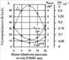 При неизменных условиях плавки чугуна и охлаждения расплава до 1350°С исследовалось влияние продолжительности обработки расплава НЭМИ (5, 10, 15 и 20 мин) на коррозионностойкость серого чугуна (см. чертеж).