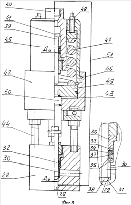 Гидроцилиндр 42 сервопривода 43 соединен шпильками 44 с корпусом 28. Стакан 45 установлен на цилиндре 42 с помощью быстроразъемного байонетного замка 46. Клапан закрывается усилием пружины 47, сжатой нажимными винтами 48 и создающей на кромке 31 седла необходимые контактные давления. Усилие пружины передается на иглу 32 через поршень 49 и шток 50 гидроцилиндра 42. Газовый цилиндр разгрузки 40 установлен внутри пружины 47 в пределах ее габаритов и направлен в сторону поршня сервопривода. Подклапанная полость 29 соединена с газовым цилиндром капилляром высокого давления 51. Клапан открывается при подаче давления под поршень 49 сервопривода 43, преодолевая усилие пружины малой жесткости и усилие трения иглы 32 и штока 39 в блоках уплотнений, а также – между поршнем 49 и гидроцилиндром 42. Использование газового цилиндра 40, соединенного с подклапанной полостью 29, позволяет уравновесить систему игла 32 клапана – шток 39 цилиндра разгрузки внутренним давлением. При равенстве диаметра штока Дш и условного прохода Ду (случай газостата-прототипа) пружина обеспечивает создание только необходимых контактных давлений на острой кромке 31, а не противодействие усилию рабочей среды высокого давления, действующего на иглу в подклапанной полости 29. В предлагаемой конструкции диаметр штока 39 Дш цилиндра разгрузки больше условного прохода Ду, в этом случае игла прижимается к седлу клапана дополнительным усилием, создавая его надежное закрытие. Соотношение площадей штока 39 и расточки подклапанной полости 29 определяется с учетом жесткости и размеров пружины 47, величины рабочего давления газостата и прочностных свойств корпуса 28 и иглы 32. Увеличение усилия открытия клапана в этом случае легко компенсируется незначительным повышением величины давления управления, используемого практически в диапазоне 5-10 МПа, что не приводит к увеличению диаметра гидроцилиндра. Таким образом, предложенное конструктивное решение уменьшает габариты, металлоемкость и стоимость унифицированных запорных клапанов и газостата в целом, а также повышает надежность работы главной – газовой системы машины.