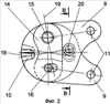 В исходном положении пломбореза (фиг.1) силовые рычаги 1 и 2 развернуты относительно оси пальца 7 на угол 90°-105°, а режущие ножи 8 и 9 встречно повернуты относительно осей пальцев качения 15 и 16 на 5-6° каждый, что соответствует полному совмещению выборок 10 и отверстий 20 для объекта резки.