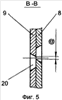 Режущие ножи 8 и 9 выполнены грушевидной формы, выборка 10 для объекта резки выполнена на их кромках 17 с большим радиусом и ориентирована по продольной оси 18 пломбореза в его исходном положении (фиг.1), противоположный конец режущего ножа 8 посредством пальца 5 шарнирно «внахлестку» связан с силовым рычагом 1, противоположный конец режущего ножа 9 аналогично связан с силовым рычагом 2, а свободные смежные отверстия 4 совмещаются и в них установлен общий для обоих силовых рычагов палец 7 их встречного качения. На противоположной стороне от оси 19, проходящей через центры пальцев 15 и 16 качения режущих ножей 8 и 9, на их поле выполнены отверстия 20 с зенковкой, формирующей дополнительные кольцевые лезвия для резки коротких мерных кусков проката, например заклепок, совмещающиеся в исходном положении пломбореза (фиг.1) и перекрывающиеся смежным режущим ножом в конечной стадии резки (фиг.2), при этом при резке стального проката допускается их неполное перекрытие с учетом величины сдвига металла (а фиг.5), составляющей 20-25% диаметра разрезаемого материала.