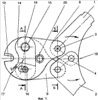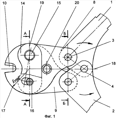 Изменение углов полного хода силовых рычагов 1 и 2, и режущих ножей 8 и 9 производят путем замены последних с требуемой длиной дугового паза 13.