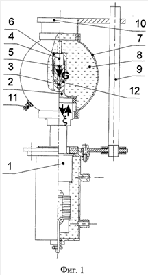 В случае, когда технологическая камера 7 выполнена из упругого неметаллического материала, облегчается процесс изменения ее объема, ускоряется сборка и разборка устройства в целом, а также благодаря резьбовому соединению упора 6 и концентратора 2.