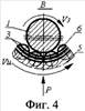 На фиг.4 показано взаимное положение заготовки и деформирующего инструмента, когда его контакт с заготовкой осуществляется по двум деформирующим элементам, в отличии от положения, показанного на фиг.3, когда контакт осуществляется по одному деформирующему элементу. Переход контакта заготовки с одного деформирующего элемента на два деформирующих элемента вызывает импульсно-ударную пластическую деформацию поверхностного слоя заготовки.