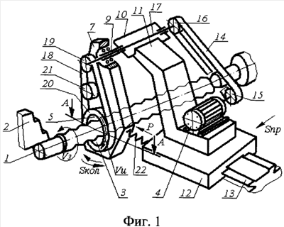 Передача вращательного движения корпусу-кольцу 5 с деформирующими элементами 6 от индивидуального привода 4 осуществляется с помощью ременной передачи 14 со шкивами 15 и 16 на промежуточный вал 17, расположенный в подшипниковом узле 10, и ременной передачи 18 со шкивами 19, 20 и натяжным шкивом 21.