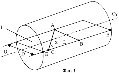 На фиг.1 обозначено: 1 – продольное осевое сечение трубы, точки Е и Е1 – соответственно первая и вторая разметочные точки, А – центр первого отверстия, С – центр второго отверстия, В – третья разметочная точка, диаметрально противоположная точке А в сечении 1, OO1 – ось трубы. Отрезок АВ равен диаметру D трубы, отрезок ВС – это отрезок разметочной линии длиной L, угол АСВ – заданный угол между осью трубы ОО1 и линией, соединяющей центры отверстий А и С на противоположных стенках трубы. Длина отрезка L равна D/tg .