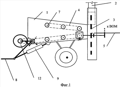 Вращающиеся режущие диски 12, имеющие жесткое крепление при помощи консоли 13 на оси подающего устройства пальчикового типа механизма подачи 6, расположенные по бокам входного окна корпуса загрузочного патрона 1, позволяют придать поступающим в корпус загрузочного патрона 1 порубочным остаткам нужные габаритные размеры. При этом подающее устройство пальчикового типа механизма подачи 6, ось которого установлена в основании нижней части входного отверстия корпуса загрузочного патрона 1, и подающие вальцы 7, перпендикулярно прикрепленные к внутренним боковым стенкам корпуса загрузочного патрона 1 в два ряда, обеспечивают постоянную подачу ветвей в корпус загрузочного патрона 1 и дальнейшее движение порубочных остатков к измельчителю 3. Вращательное движение подающего устройства пальчикового типа механизма подачи 6 и подающих вальцов 7, а соответственно и линейное движение измельчаемого материала в корпусе загрузочного патрона 1 с определенной скоростью подачи, обеспечивается при помощи ременной передачи 4 и системы шкивов, состоящей из шкивов 14, шкива 15, шкива 16, которые через понижающий редуктор 20 с валами 17, 18, приводного вала 5 и клиноременную передачу 19 соединены с валом отбора мощности трактора. Форма корпуса загрузочного патрона 1 и расположенные в нем подающие вальцы 7 способствуют уплотнению массы порубочных остатков для измельчения. Измельчение порубочных остатков происходит при помощи режущих элементов, расположенных на фронтальной части измельчителя 3. Измельченные части крон и ветвей под действием центробежной силы транспортируется через щепопровод 2 в приемную тару или остаются на вырубке для перегнивания.