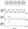 Второй способ получения порций материала проиллюстрирован на Фигуре 16. Этот способ отличается от способа, проиллюстрированного Фигурой 15, тем, что объемные скорости слоев полимеров 2 и 4 периодически изменяются и противоположны по фазе, так что общая объемная скорость остается постоянной или изменяется очень мало. Объемная скорость функционального слоя остается постоянной. Многослойный стержень обрезают на выходе из устройства для совместной экструзии с частотой, определяющейся периодическими колебаниями объемных скоростей слоев 2 и 4. Этот способ может быть полезным для устранения недостатков, связанных со слишком резкими изменениями общей объемной скорости (нестабильность экструзии, «апельсиновая корка»). Колебания объемных скоростей слоев 2 и 4 на выходе из устройства для совместной экструзии обычно являются градуальными, даже если управляющий сигнал стробирован, как показано на Фигуре 15. Этот феномен связан с инертностью полимера в устройстве. Также можно прогрессивно регулировать вариации объемной скорости благодаря использованию соответствующих устройств.