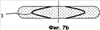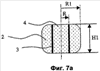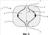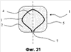 Фигура 21 иллюстрирует другую многослойную порцию материала, особенно хорошо подходящую для получения многослойных изделий посредством компрессионного формования. Эта порция материала состоит из первого слоя полимера 4, образующего внутреннюю часть порции, тонкого слоя функционального полимера, инкапсулирующего слой полимера 4, и слоя полимера 2, образующего наружный слой порции материала и инкапсулирующего слой функционального полимера 3. Функциональный слой 3 имеет трехмерную осесимметричную геометрию в форме груши и имеет конец 7, расположенный вблизи оси симметрии и образующий небольшое, слегка коническое отверстие. Слой 3 пересекает ось симметрии в точке, расположенной напротив указанного конца 7.