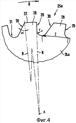 В противоположность этому, задняя боковая поверхность 30 зуба образует угол , равный 30°, с нормалями N к оси А вращения. Можно видеть, что вследствие этого образуется очень широкая ножка Z зуба, после которой боковые поверхности зубьев расходятся в направлении основания 31 зуба. Кроме того, основание зуба 31 полностью скруглено, что возможно за счет ширины ножки Z зуба и, тем самым, сужающегося к сердечнику вала промежуточного пространства между зубьями. Радиус r скругления составляет, например, 0,35 м. Сама головка 32 зуба в показанном примере является по существу плоской, она лишь слегка изогнута в соответствии с наружным радиусом наружного зубчатого венца.