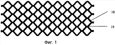 Ячеистая георешетка, изготовленная в соответствии с заявляемым изобретением, представлена на чертежах, а именно на фиг.1 проиллюстрирован вид сверху растянутой георешетки, на фиг.2 – вид ленты сбоку, после сложения в позицию для транспортировки. На обеих фигурах видны ленты 18, из которых изготовлена георешетка, а также места шва 19 лент 18.