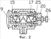 При опускании порожней платформы гидроцилиндр 9 складывается медленно, рабочая жидкость из гидроцилиндра 9 через центральное отверстие 16 заданного диаметра в плунжере 15 и радиальные каналы 12 регулировочного клапана 8, клапан управления 7, фильтр 5 поступает в масляный бак 4. Так как разность давлений в полостях 27 и 28 незначительная, плунжер 15 не перекрывает радиальные каналы 12 в корпусе 10 и замедления опускания порожней платформы не происходит.