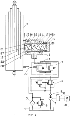 Корпус 10 регулировочного клапана 8 установлен непосредственно на гидроцилиндре 9, и в нем выполнены ступенчатый осевой канал 11 и радиальные каналы 12, соединяющие его через наконечник 13 и трубопровод 14 с клапаном управления 7. Корпус 10 регулировочного клапана 8 является одновременно и переходником наконечника 13 (Фиг.1). В ступенчатом осевом канале 11 корпуса 10 размещен плунжер 15 с центральным отверстием 16 заданного диаметра, поджатый пружиной 17, входящей в центральные каналы 18 и 19 соответственно плунжера 15 и пробки 20, ввернутой в корпус 10, к торцу 21 ступенчатого осевого канала 11. Наружная поверхность плунжера 15 снабжена кольцевой проточкой 22 с выполненным в ней дроссельным радиальным каналом 23, соединяющим при рабочем положении плунжера 15 его центральный канал 18 с радиальными каналами 12 в корпусе 10. Между пробкой 20 и корпусом 10 установлены регулировочные прокладки 24. Вместо регулировочных прокладок в центральном канале 19 пробки 20 может быть размещена подвижная опора 25 пружины 17, на которую воздействует регулировочный болт 26, ввернутый в резьбовое отверстие пробки 20, обеспечивающий регулировку усилия сжатия пружины 17 плунжера 15 (Фиг.2). Плунжер 15 в корпусе 10 образует полость 27, сообщающуюся с гидроцилиндром 9, и полость 28, сообщающуюся с радиальными каналами 12. Клапан управления 7 тросом 29 соединен с гидроцилиндром 9. Привод насоса 1 осуществляется от двигателя 30 через коробку отбора мощности 31.