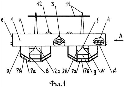 Экранолет, состоящий из корпусов 2а и 2b, скрепленных в верхней части крылом 1, помещают в условия акватории, защищенной от волнений. Через двери 6 на боковой стенке е крыла производят загрузку полости-салона 4 пассажирами и/или грузами так, чтобы корпуса не погружались в воду ниже ватерлинии W. При этом в светлое время суток полость-салон обеспечивается естественным освещением через окна 5. После завершения погрузочных операций и вывода экранолета на открытую поверхность акватории (искусственного бассейна, реки, озера, моря) экипаж из кабины 3 включает двигатель (двигатели) 12 в режимы разгона и взлета. Воздушный поток, обтекая поверхности с и d крыла, создает подъемную силу, достаточную для частичного (режим взлета) и полного (режим полета) вывода корпусов из акватории. При этом заостренный нос f корпуса, имеющего днище g, снижает гидравлическое и аэродинамическое сопротивление. Подводные крылья 7а и 7b или 7с и 7d, прикрепленные стойками 8 к корпусам и распорками 9 к крылу, создают подъемную силу, вызывающую всплытие корпусов над поверхностью акватории, что обеспечивает экранолету короткий «разбег». Воздушный поток, набегающий на подводное крыло, в случае его зависания над поверхностью акватории сообщает ему дополнительную подъемную силу, хотя и значительно меньшую, чем та, что возникает в воде. При полете экранолета на малой высоте вследствие близости поверхности акватории возникает упругая «воздушная подушка», которая ослабевает и исчезает при выключении двигателя (двигателей). Для образования более упругой «водушной подушки» под крылом экранолета (за счет уменьшения расстояния между летящим экранолетом и поверхностью акватории) используют подвижные подводные крылья, например, поворачивающиеся на шарнирах 10. Управление режимами полета над поверхностью акватории, изменения курса экранолета осуществляется с помощью двухкилевого оперения 11 и элеронов (не показаны) крыла со стороны киля. При выключении двигателя (двигателей) происходит посадка экранолета с погружением корпусов в воду. Совершивший посадку экранолет перемещают к месту выгрузки пассажиров и грузов.