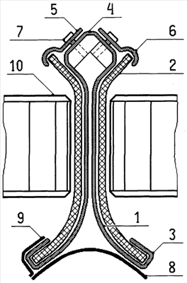 Позициями обозначены: 1 – металлический направляющий элемент, 2 – сменное покрытие из материала типа конвейерной ленты, 3 – паз для размещения нижнего края сменного покрытия, 4 – ромбовидное утолщение в верхней части направляющего элемента, 5 – прижимные накладки, 6 – полуцилиндрические выступы на прижимных накладках, 7 – затяжные болты, 8 – изогнутая в форме арки несущая упругая лента, 9 – крепежные детали, 10 – приводные боковые колеса транспортного средства.
