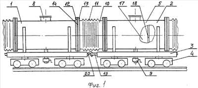 Сцепленные рамы 3 состава 1 соединены сцепными устройствами 19, 20. Герметичные цилиндрические корпуса 5 фланцами 12 соединены через прокладки 14 с фланцами 13 цилиндрических участков 16 с поперечными гофрами 11 с помощью крепежных элементов 15 с гайками 16.