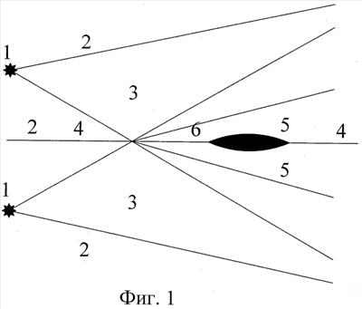 “Способ проводки речных и морских судов по заданной траектории”, защищенный патентом на изобретение в РФ в 2005 году, который состоит в том, что два лазерных луча, генерируемые двумя лазерными маяками 1, развернутые по вертикали, синхронно сканирующие навстречу друг другу в азимутальной плоскости с заданной частотой и накладывающиеся при встречном движении, образуют три трехмерные области, заполненные лазерным излучением: область синхронного свечения 5, служащую указателем точного курса для движущегося объекта 6, и две области асинхронного свечения 3, позволяющие оценить знак и степень отклонения движущегося объекта от заданной траектории 4 (см. фиг.1 и 2) (RU 2302357 С2, МПК В63В 51/02 (2006.01).