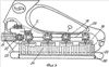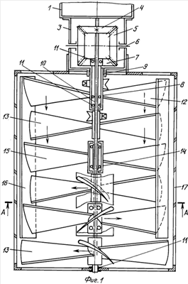 На фиг.2 – поперечный разрез по “А-А” на фиг.1. Стрелками показано направление вращения центральных лопастных винтов и лопастных реверс-винтов и подсос воздуха разрежением, создаваемым нагнетателями аэродинамического профиля.