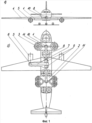 Изобретение выполнено в двух вариантах: с расположением ПНТП в бортовых нишах фюзеляжа и с расположением ПНТП в наружных обтекателях. Сущность заявляемого изобретения поясняется чертежами, на которых показано: