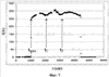 Для примера на фиг.7 представлен график прихода электроэнергии от СБ PC MKC I(А) от времени t (сек) в течение витка орбиты при поддержании ориентации СБ на Солнце: 02.02.2004 г., виток 1704 (телеметрический номер), время 17.35-19.06 ДВМ, ориентация ИСК (см. [6]). На графике отмечены моменты времени t1 и t2, соответствующие выполнению условия (4): два момента на витке – до и после середины светового участка орбиты. В данные моменты времени отраженное от Земли излучение поступает на торцевую сторону панелей СБ, чем обеспечивается минимизация не прогнозируемого и не подлежащего учету завышения регистрируемых значений выходной мощности СБ.