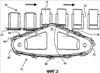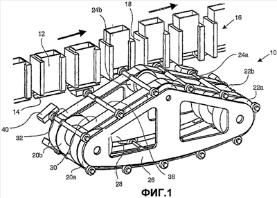 Валы 38 фиксированно расположены по отношению к ремням 30, 32, по существу, под прямыми углами к направлению движения. Прикрепление этих валов 38 к ремням 30, 32 излагается ниже. На каждом вале 38 прикреплен носитель 40. Носитель 40 выполнен в виде пластины и шарнирно прикреплен на одном конце вала 38, который проходит наружу от привода шкива. Указанная шарнирность выполнена таким образом, что пластина 40 представляет собой коромысло, выполненное с возможностью поворота вокруг вала 38 в такой степени, что верхняя поверхность пластины может быть, по существу, параллельна первому направлению, даже если вал 38, к которому она прикреплена, расположен, например, в первой части 34, т.е. перемещается во втором направлении. Поэтому пластина 40 выполнена с возможностью шарнирного поворота, по меньшей мере, на величину угла по отношению к валу 38. Когда пластина 40 упирается в упаковочный контейнер 12 и при этом прилагается усилие, она саморегулируется и достигается равновесие сил.