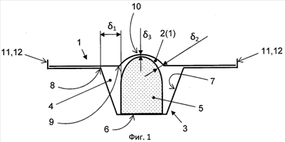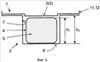 2 (3) округлой формы, расположенными между изделиями 5 (1) и 5 (2) для предотвращения их (изделий) горизонтальных перемещений. Коррекс 3 имеет ячейки 4, образованные разделительными выступами 14 на дне коррекса (высота выступов 14 меньше высоты центра масс изделия 5). Изделия 5 расположены в ячейках 4. При этом каждое изделие 5 представляет собой либо целостное изделие, либо штабель изделий, так что высота h1 изделия 5 равна или меньше высоты h2 коррекса 3. Крышка-фиксатор 1 расположена на коррексе 3 с фиксацией от горизонтальных перемещений относительно коррекса. Эта фиксация обеспечивается буртиками 11, 12 (см. первую модификацию фиксации крышки-фиксатора в первом и втором вариантах изобретения). Каждое изделие 5, например 5 (1), расположено в соответствующей ячейке 4 коррекса с зазором 1 между вершиной пограничного выступа 2 (3) крышки-фиксатора 1 и боковой стенкой изделия 5 (1), с зазором 2 между боковой поверхностью пограничного выступа 5 (1) крышки-фиксатора и верхней угловой поверхностью изделия 5 и с зазором 3 между плоскостью крышки-фиксатора 1 и верхней поверхностью изделия 5, так что либо 1> 2> 3, либо 3> 2 и 1> 2, либо 3> 2 и 3> 1.