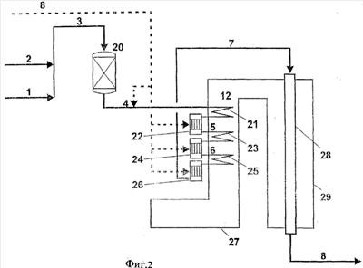Фиг.1 изображает обычную систему, где перерабатываемый газ из углеводородного сырья [1] и водяного пара [2] вводят в установку предварительного реформинга [20] при температурах приблизительно от 450°С до 550°С. При реакциях реформинга с водяным паром, протекающих в установке предварительного реформинга, температура в перерабатываемом газе обычно слегка уменьшается или увеличивается при проведении процесса предварительного реформинга в зависимости от углеводородного сырья, это фактически является адиабатическим процессом. Поток продукта предварительного реформинга [4] и необязательно диоксид углерода [8] вводят в нагревающий змеевик. Необязательное добавление CO2 обозначено штриховой линией.