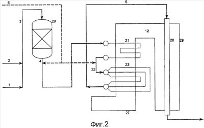 Фиг.1 изображает обычную систему, где перерабатываемый газ из углеводородного сырья [1] и водяного пара [2] вводят в установку предварительного реформинга [20] при температурах приблизительно от 450°С до 550°С. В реакциях реформинга с водяным паром, протекающих в установке предварительного реформинга, температура в перерабатываемом газе обычно слегка уменьшается или увеличивается при проведении процесса предварительного реформинга в зависимости от углеводородного сырья, это фактически является адиабатическим процессом. Поток продукта предварительного реформинга [4] и необязательно диоксид углерода [8] вводят в нагревающий змеевик. Необязательное добавление CO2 обозначено штриховой линией.