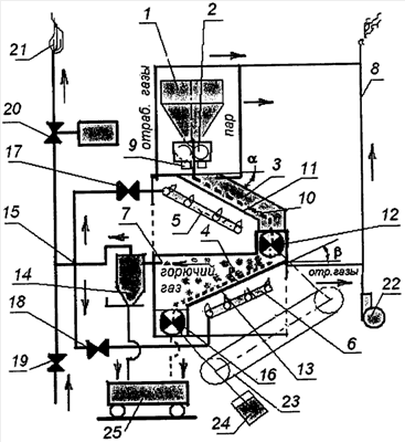 Кроме того, на чертеже изображены вентили 17, 18, 19 газораспределительной системы 15; регулируемый вентиль 20 для поддержания в системе необходимого избыточного давления горючего газа; факел 21 сгорания избыточных горючих газов; вентилятор 22 системы удаления отработанных газов и пара; вал 23 привода механизмов шлюзовых камер 12 и 16; кинематическая связь 24 между шлюзовыми камерами; электропривод 25 кинематической связи 24.